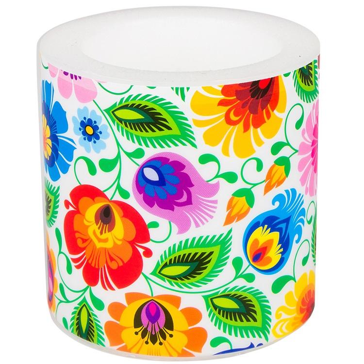 Dekoracyjna świeca lampion FOLK z ludowym wzorem kwiatów z łowickiej wycinanki na białym tle: projekt inspirowany tradycyjnymi wzorami ludowymi z wycinanek łowickich,podstawowymi elementami wycinanek łowickich są koguty, pawie oraz motywy kwiatowe,po zapaleniu lampionu światło płomienia pięknie oświetla zewnętrzny wzór,estetyczne opakowanie z celofanu i szarego sznurka