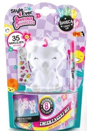 Zawartość opakowania: 1 świecący zwierzaczek do dekoracji, 2 arkusze brokatowych naklejek, 2 mazaki. W asortymencie: 5 różnych zwierzaczków (2 jednorożce, piesek, kotek, koala).