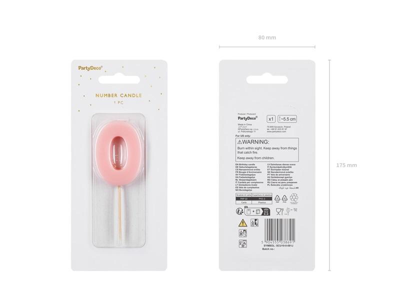 Świeczka urodzinowa Cyferka 0, w kolorze jasnoróżowym, rozmiar ok. 5.5 cm.