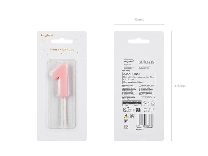 Świeczka urodzinowa Cyferka 1, w kolorze jasnoróżowym, rozmiar ok. 5.5 cm