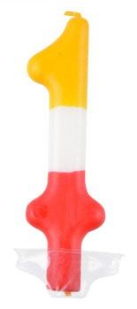 Świeczka urodzinowa w kształcie cyferki wykonana z trójkolorowego wosku: czerwonego, białego i żółtego. Wysokość świeczki 10,5 cm.