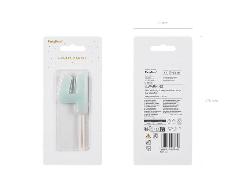 Świeczka urodzinowa Cyferka 4, w kolorze jasnoniebieskim, rozmiar ok. 5.5 cm.