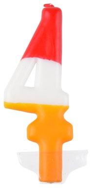 Świeczka urodzinowa w kształcie cyferki wykonana z trójkolorowego wosku: czerwonego, białego i żółtego. Wysokość świeczki 10,5 cm.