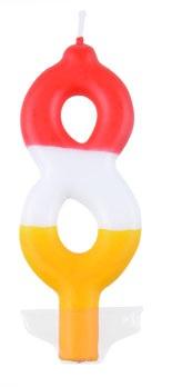 Świeczka urodzinowa w kształcie cyferki wykonana z trójkolorowego wosku: czerwonego, białego i żółtego. Wysokość świeczki 10,5 cm.