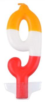 Świeczka urodzinowa w kształcie cyferki wykonana z trójkolorowego wosku: czerwonego, białego i żółtego. Wysokość świeczki 10,5 cm.