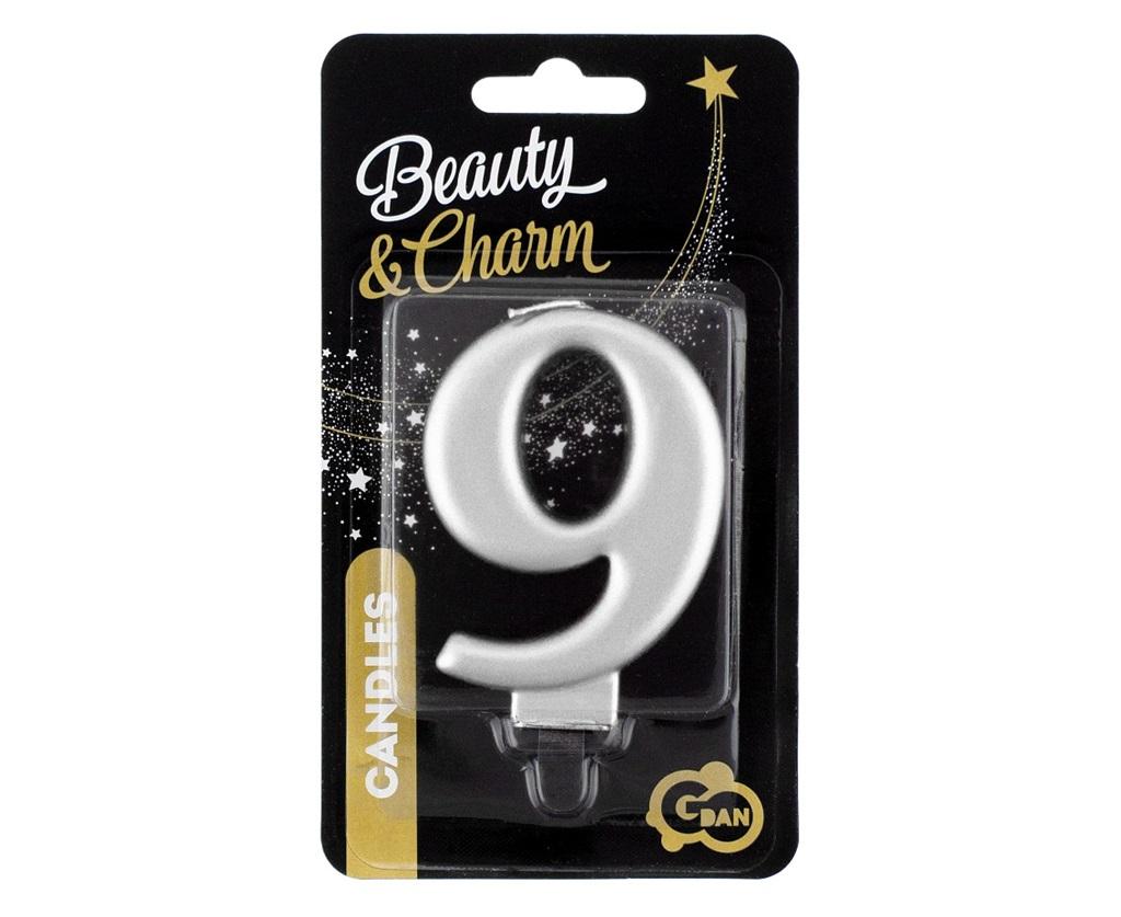ŚWIECZKA CYFERKA 9, METALICZNA SREBRNA, B&C