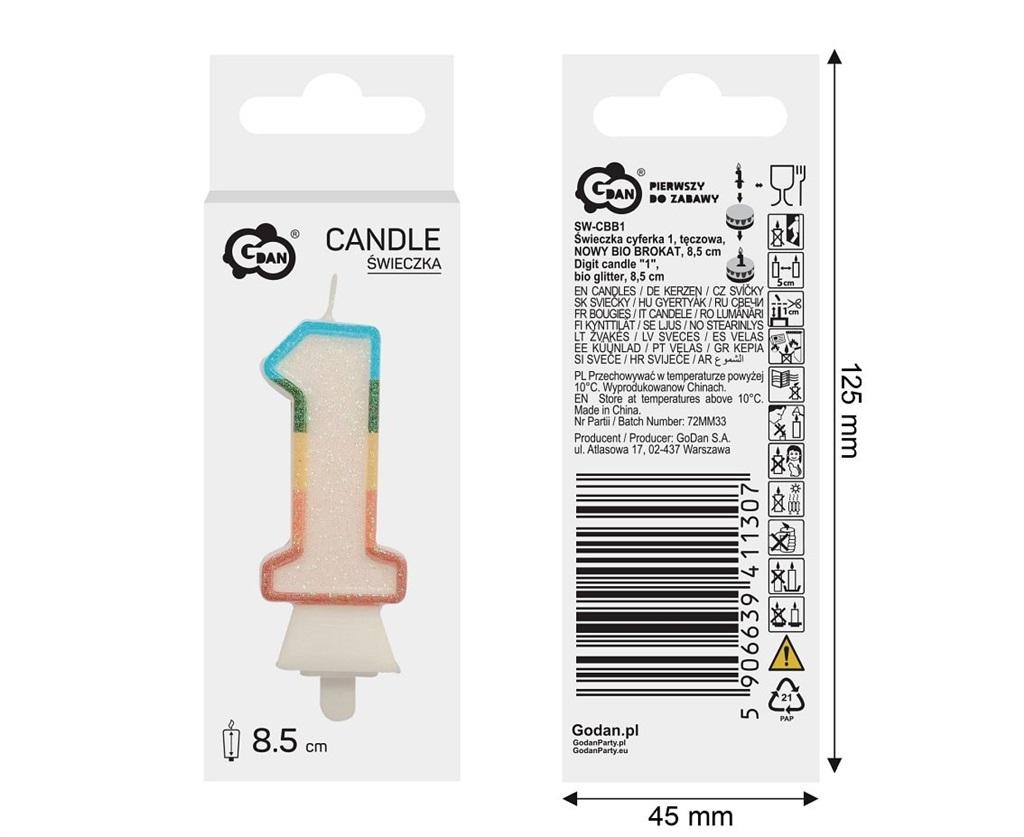 Opakowanie Świeczka cyfra 1 tęczowa 8,5cm