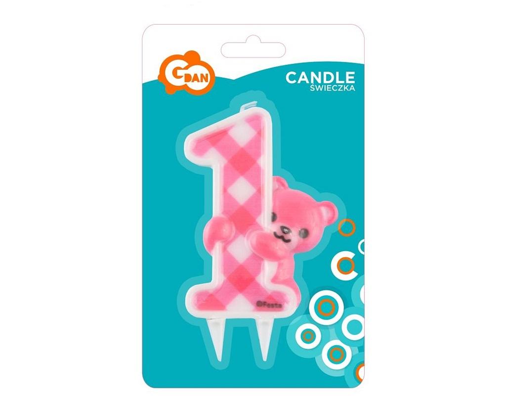 Opakowanie Świeczka cyfra 1 urodziny różowy Miś