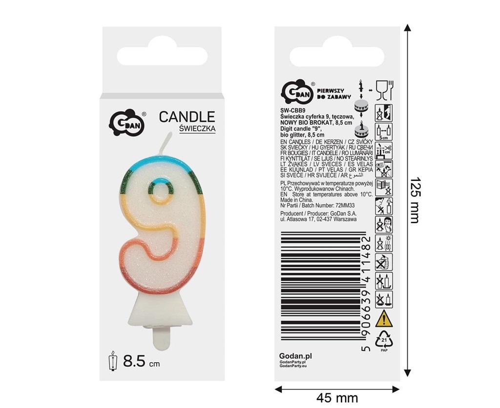 Opakowanie Świeczka cyfra 9 tęczowa 8,5cm