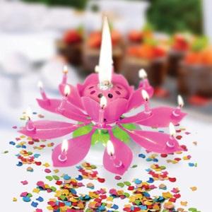 Nietuzinkowa świeczka urodzinowa w kształcie zamkniętego pąku kwiatowego w kolorze niebieskim. Po zapaleniu głównej, środkowej świeczki kwiat otwiera się, kręci oraz gra melodię "Happy Birthday". Na każdym płatku znajdują się małe świeczki, które odpalają się samodzielnie od świeczki głównej dając wyjątkowy efekt wizualny. Świeczka o wysokości 11,5 cm. Szerokość po rozłożeniu płatków około 17 cm. Produkt posiada atest PZH.