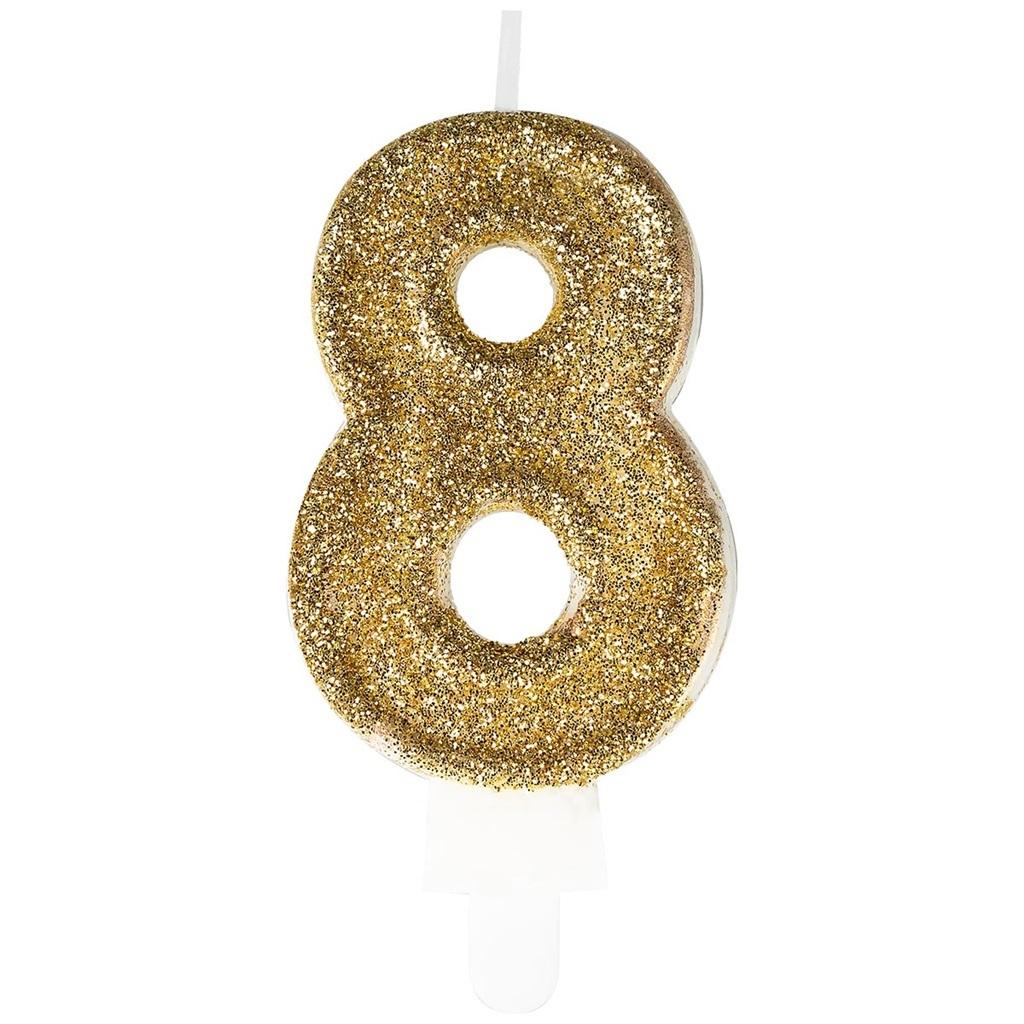 Świeczka cyferka brokatowa na podstawce Wysokość świeczki 7,5 cm Dostępne kolory: złoty, srebrny