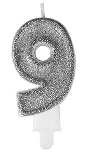 Świeczka cyferka brokatowa na podstawce Wysokość świeczki 7,5 cm Dostępne kolory: złoty, srebrny