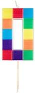 Świeczka urodzinowa w kształcie cyfry 0 z motywem kolorowych klocków. Idealna jako dopełnienie dekoracji tortu. Posiada element umożliwiający stabilne wbicie świeczki w ciasto. Wysokość świeczki to 7 cm.