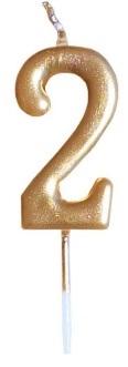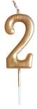 Świeczka metalizowana złota "2", na pikerze. Wysokość świeczki 6 cm, wysokość z pikerem 8 cm.