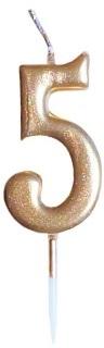 Świeczka metalizowana złota "5", na pikerze.Wysokość świeczki 6 cm, wysokość z pikerem 8 cm.