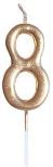 Świeczka metalizowana złota "8", na pikerze, Wysokość świeczki 6 cm, wysokość z pikerem 8 cm.
