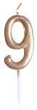 Świeczka metalizowana złota "9", na pikerze, Wysokość świeczki 6 cm, wysokość z pikerem 8 cm.