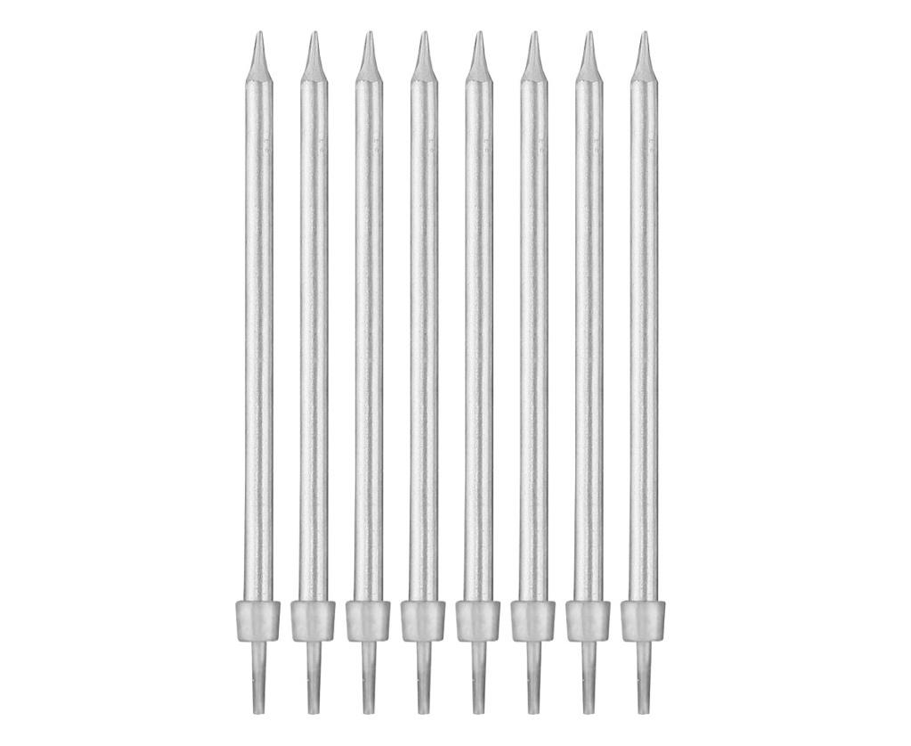 świeczki urodzinowe na tort, długie, srebrne, 8 szt.