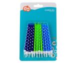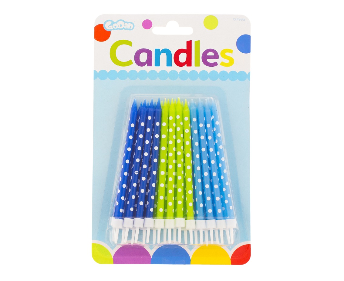 Opakowanie zawiera 24 świeczki z nadrukiem w grochy. Kolory- granatowy, ziełony,niebieski .