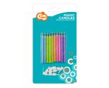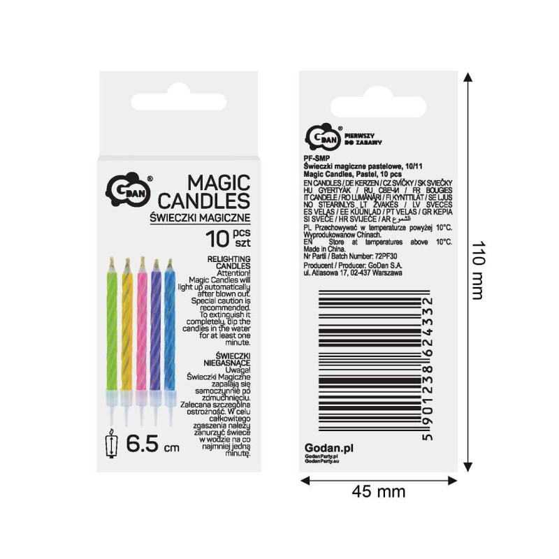 Świeczki magiczne pastelowe, 10/10 Magiczne świeczki, które po zdmuchnięciu zapalają się kilka razy. Opakowanie zawiera 10 kolorowych świeczek. 5 kolorów w opakowaniu: niebieski*2, zielony*2, żółty*2, różowy*2, fioletowy*2. Opakowanie zawiera również podstawki na każdą świeczkę. UWAGA - Ze względu na fakt, iż świeczki nasączone są płynem powodującym kolejny zapłon mają lekko szarawy odcień.