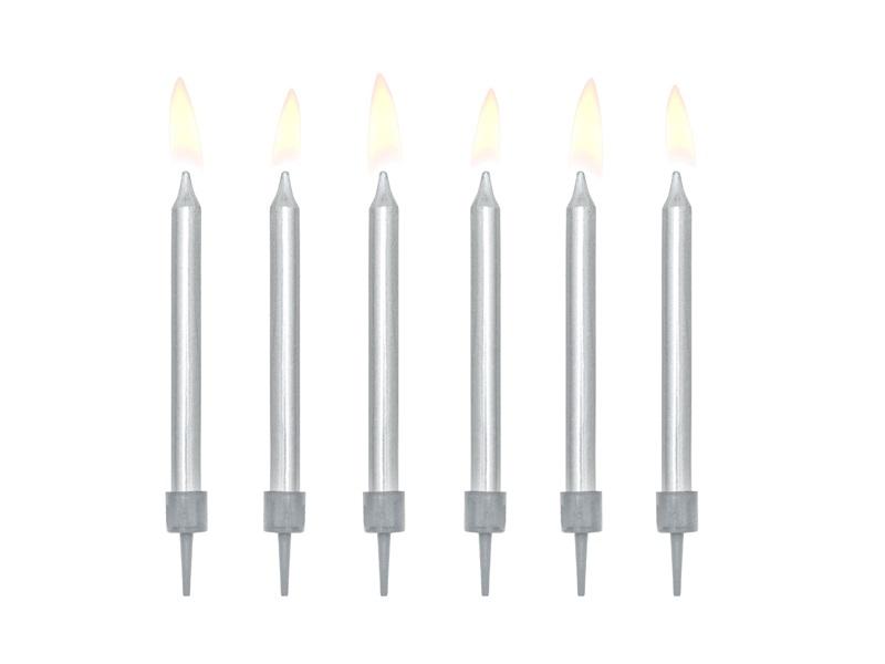 Świeczki urodzinowe gładkie w kolorze srebrnym metalizowanym, rozmiar ok. 6 cm, w zestawie 6 świeczek i 6 podstawek.(1 op. / 6 szt.)