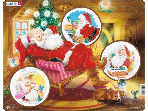 Puzzle świąteczne przedstawiające Świętego Mikołaja drzemiącego przy kominku. Mikołaj najprawdopodobniej śni o tych wszystkich ważnych zadaniach, które ma do wykonania. Niektóre elementy mają kształty samolotu, pieska, wiewiórki i ptaszka. Ilość elementów: 33 Rozmiar: 36.5 x 28.5 cm Wielkość: MAXI