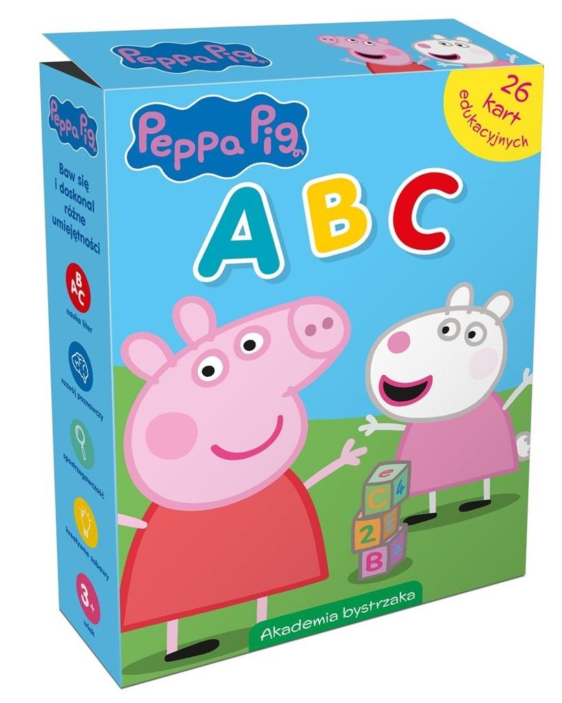 Peppa i przyjaciele zapraszają do akademii bystrzaków. W pudełku przedszkolak znajdzie 26 dwustronnych kart obrazkowych, dzięki którym pozna alfabet, będzie szukał wyrazów zaczynających się na daną literę i przygotowywał się do nauki czytania. W środku maluch odkryje również mnóstwo zabaw rozwijających spostrzegawczość i logiczne myślenie, a wszystko w towarzystwie swoich ulubionych bohaterów.