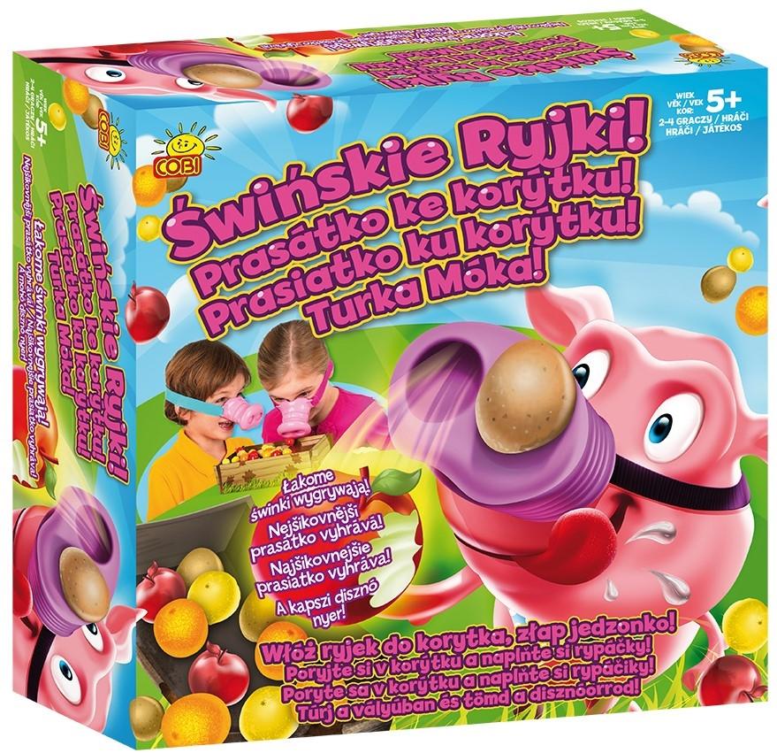 Załóż ryjek, rzuć kostkami i zacznij zbierać ryjkiem jedzonko z korytka. Złap ryjkiem jak najwięcej jedzonka, nim inne Łakome Świnki będą mogły je zbierać. Uważaj, mogą też zabrać Ci jedzonko! Wygrywa ten gracz, który pierwszy zbierze, co najmniej po jednym rodzaju pokarmu. Wiek: 5+ Zawartość pudełka: - 4 ryjki z regulowanymi paskami - 5 cytryn - 5 pomarańczy - 5 ziemniaków - 5 jabłek - kostka - zasady gry