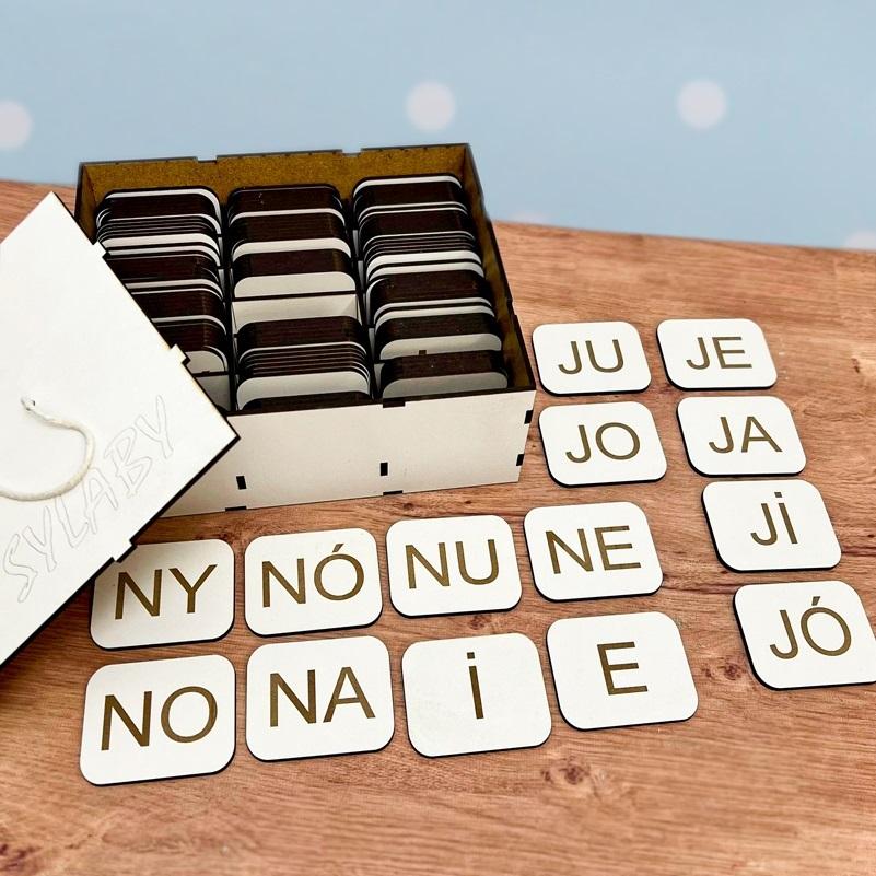 Sylaby oraz samogłoski wygrawerowane są na płytkach drewnianych wielkości 6,5 cm x 5,5 cm.