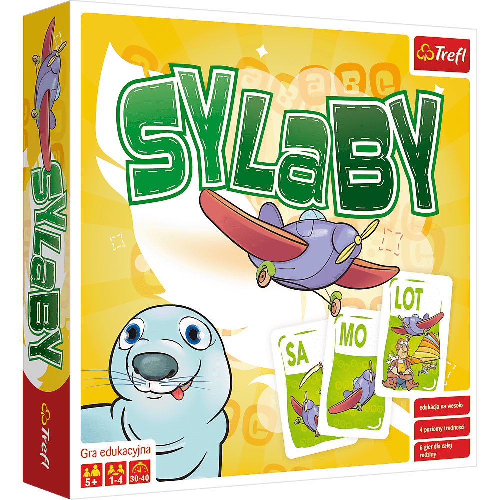 Sylaby to zestaw gier i zabaw wspomagających naukę czytania. Dwie talie odpowiednio skonstruowanych kart, dwie obustronnie zadrukowane plansze oraz zestaw reguł do sześciu zróżnicowanych gier pozwalają dobrać odpowiednią zabawę do liczby graczy oraz poziomu ich umiejętności. Możliwa jest zarówno rozgrywka całej rodziny, duetu rodzic - dziecko, jednej osoby, jak i większej grupy dzieci, np. podczas spotkania na imprezie urodzinowej. Elastyczność reguł i duże możliwości doboru komponentów gry pozwalają podnosić poziom trudności wraz z rozwojem u dziecka umiejętności czytania. Wiek graczy: 5+ Liczba graczy: 1-4 Czas rozgrywki: 30-40 minut
