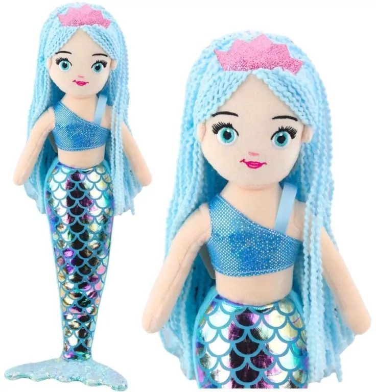 Pluszowa lalka syrenka o wysokości 48 cm to wyjątkowa zabawka, która przyciąga wzrok swoim morskim stylem i starannym wykonaniem. Posiada długie, miękkie włosy w kolorze jasnego błękitu, uformowane w sznurkowe pasma oraz połyskujący holograficzny ogon przypominający rybie łuski w turkusowo-niebieskich barwach. Syrenka ubrana jest w brokatowy top na jedno ramię w kolorze niebieskim oraz ozdobiona jest różową tiarą, co nadaje jej bajkowego, wyglądu. Całość doskonale wpisuje się w klimat magicznych podwodnych opowieści, które dzieci tak bardzo uwielbiają. Lalka jest przyjemna w dotyku, miękka i lekka, dzięki czemu może być używana zarówno do zabawy, jak i przytulania. Sprawdzi się również jako dekoracja dziecięcego pokoju. Idealna dla maluchów już od pierwszych miesięcy życia i świetna jako prezent. SPECYFIKACJA: Wymiary: 48 x 10 x 6 cm Materiał: plusz, błyszcząca tkanina, włóczka (włosy) Kolor ogona: turkusowo-niebieski, holograficzny (efekt łusek) Kolor włosów: jasnoniebieski Elementy ozdobne: różowa tiara, niebieski top z brokatem Przeznaczenie: zabawa, przytulanie, dekoracja ZAWARTOŚĆ ZESTAWU: Pluszowa lalka syrenka z holograficznym ogonem