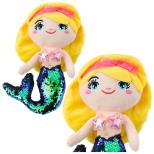 SPECYFIKACJA: Wymiary: 30 x 15 x 6 cm Materiał: miękki plusz, cekiny, tworzywo sztuczne Kolor ogona: zielony z efektem zmiany na czarny Kolor włosów: żółty Dodatki: kokardka, gwiazdki na tułowiu Przeznaczenie: do zabawy i przytulania ZAWARTOŚĆ ZESTAWU: Pluszowa syrenka z cekinowym ogonem