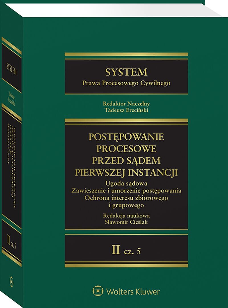 System Prawa Procesowego Cywilnego to wielotomowe dzieło pod redakcją naczelną prof. dra hab. Tadeusza Erecińskiego. Prezentujemy Państwu kolejną publikację z tej serii, stanowiącą część 5 tomu II "POSTĘPOWANIE PROCESOWE PRZED SĄDEM PIERWSZEJ INSTANCJI". W książce pod redakcją naukową prof. dra hab. Sławomira Cieślaka omówiono: ugodowe załatwianie spraw cywilnych, zawieszenie i umorzenie procesu cywilnego oraz procedury służące ochronie interesu zbiorowego i grupowego. Sposób ujmowania zagadnień procesowych cechuje swego rodzaju ponadczasowość, tzn. że oprócz obowiązującego stanu prawnego sygnalizowane są również kierunki projektowanych zmian oraz postulaty de lege ferenda pod adresem ustawodawcy. Najwyższy poziom merytoryczny i przejrzysty układ dzieła z pewnością sprawią, że publikacja będzie stanowić nieocenioną pomoc przede wszystkim dla prawników praktyków: sędziów, referendarzy sądowych, adwokatów, radców prawnych, notariuszy, komorników.