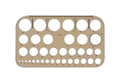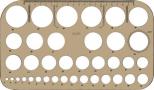 Szablon kołowy umożliwiający precyzyjne kreśleniełuków o promieniach od 1 do 40 mm oraz kół opromieniach od 0,8 do 2,5 mm. Wykonany z dymionego tworzywa sztucznego, posiadający wypustki zabezpieczające przed rozmazywaniem rysunku.