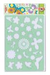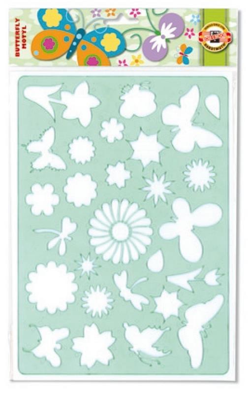Szablony idealne do dziecięcych zabaw oraz samodzielnego przygotowywania różnego rodzaju ozdób. Do odrysowywania ołówkiem, cienkopisem, kredkami. Wzór łąka - motyle i kwiaty.