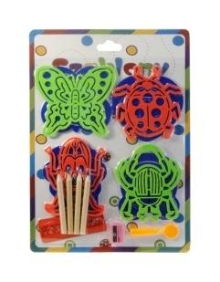 Zabawka szablony składa się z ośmiu tablic szablonowych, linijki, temperówki, zestawu kolorowych kredek. Szablony przedstawiają m.in.:zwierzęta, kwiaty. Produkt dla dzieci od 3 lat. Produkt zapakowany w kartonową podstawkę z przezroczystym kloszem. Podane wymiary są wymiarami opakowania.