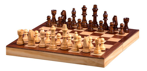 Szachy wykonane z drewna. Wymiar szachownicy 27,5 x 27.5 x 2,5 cm. Król o wys. 7 cm.