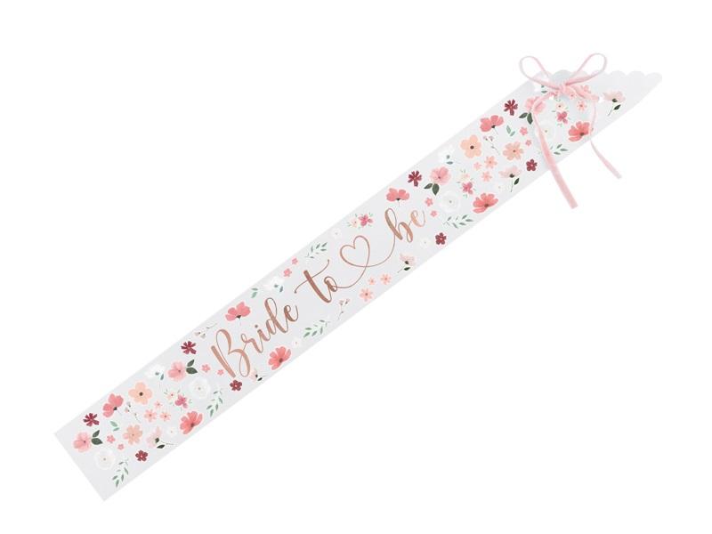 Szarfa papierowa Bride to be w kolorze białym z kolorowym nadrukiem oraz metalizowanym napisem w kolorze różowego złota, szerokość ok. 9,5 cm, długość ok. 76 cm.