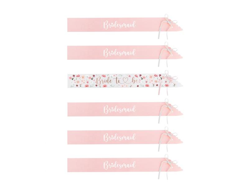 Szarfy papierowe Bride to be i Bridesmaid, zestaw zawiera 6 szarf: 1 w kolorze białym z kolorowym nadrukiem oraz metalizowanym napisem w kolorze różowego złota i 5 w kolorze różowym z białym napisem, szerokość ok. 9,5 cm, długość ok. 76 cm.(1 op. / 6 szt.)