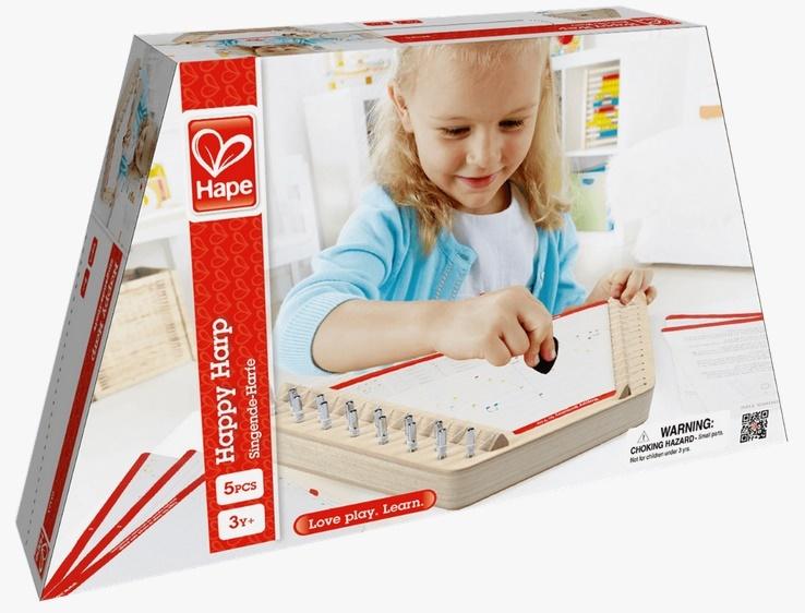 Szczęśliwa Harfa to zabawka muzyczna marki Hape, dzięki której dziecko zagra swoje ulubione dźwięki. Ten niezwykły instrument strunowy dopasowanym jest do małych, dziecięcych rączek. Dzięki harfie dzieci mogą ćwiczyć swój słuch oraz tworzyć pierwsze dźwięki. Zestaw zawiera wskazówki, nuty pięciu piosenek oraz czystą kartkę do tworzenia swoich własnych piosenek.