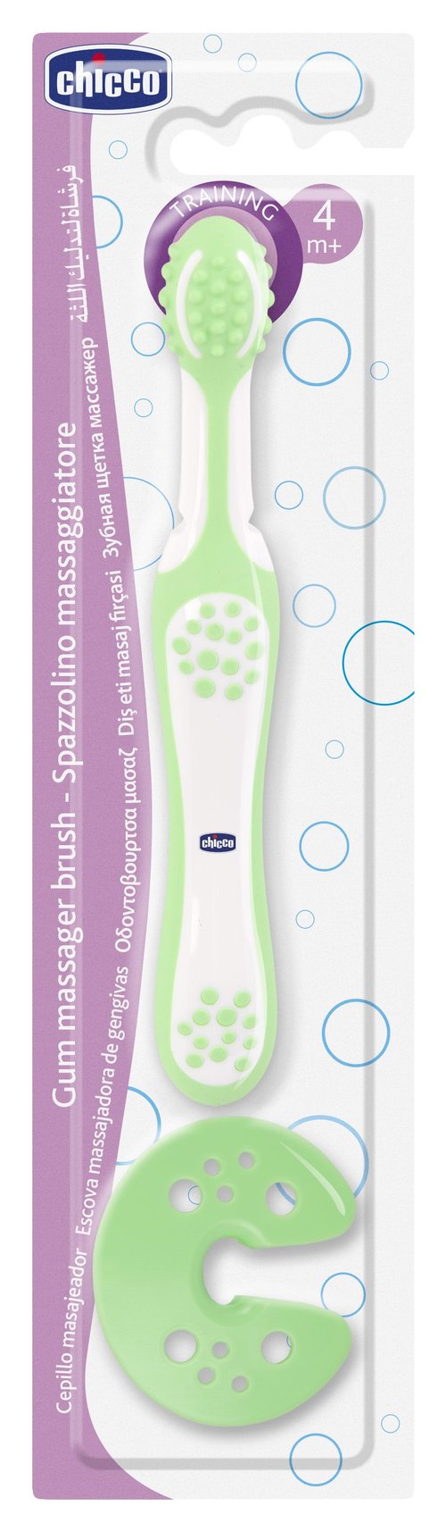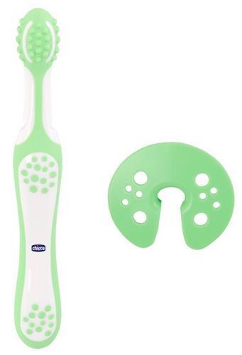 Specjalna osłonka utrzymuje szczoteczkę w bezpiecznej odległości od tylnej ściany jamy ustnej dziecka. Mała, zaokrąglona główka szczoteczki z masującymi wypustkami przynosi ulgę podrażnionym dziąsłom.