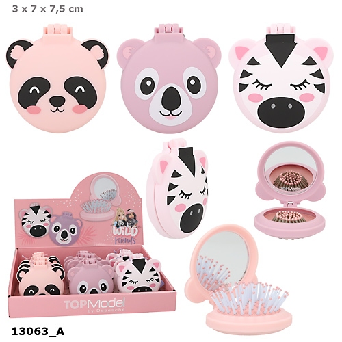 Składana szczotka do włosów Top Model z nadrukami uroczych zwierzęcych buziek i uszkami. W środku lusterko.