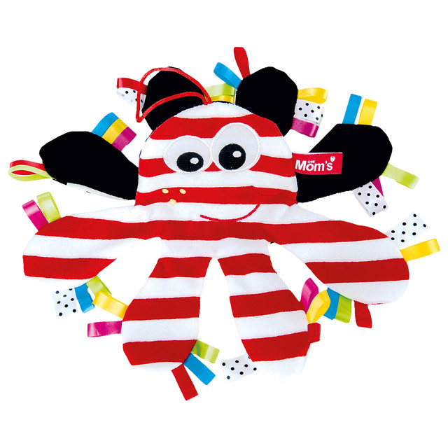 Ośmiornica wypełniona jest szeleszczącą folią, której delikatny dźwięk przykuwa uwagę najmłodszych, dostarczając bodźców słuchowych. Delikatny szelest uspokaja maluszka, ponieważ kojarzy mu się z dźwiękami, które słyszał będąc w brzuszku mamy. Kolorowe macki ośmiornicy i liczne metki zachęcają do chwytania, stymulują prawidłowy rozwój motoryki małej i koordynacji ręka-oko. Szeleścik jest lekki i łatwo się go trzyma dlatego może towarzyszyć dziecku już od pierwszych chwil, zarówno w łóżeczku, jak i na spacerze.