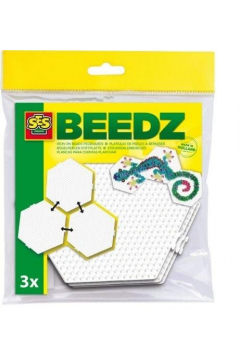 Specjalna podstawka z wypustkami do ułożenia mozaiki z koralików w sześciokątnym kształcie. Po ułożeniu koralików na szablonie, można przeprasować je przez pergamin aby otrzymać trwały obrazek. W opakowaniu trzy sztuki.