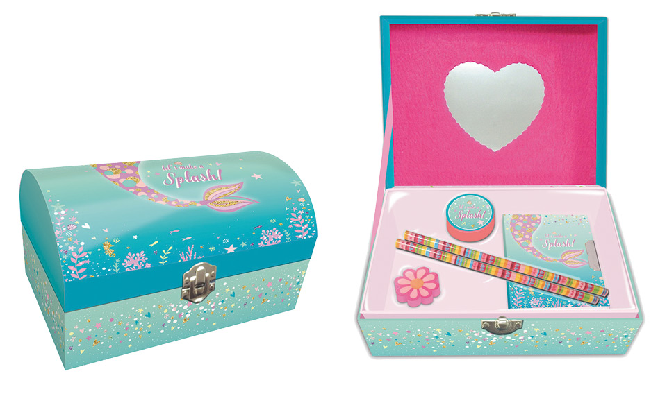 Kartonowa zamykana szkatułka z lusterkiem na wieczku. W zestawie także pamiętnik, temperówka, gumka do ścierania i dwa ołówki