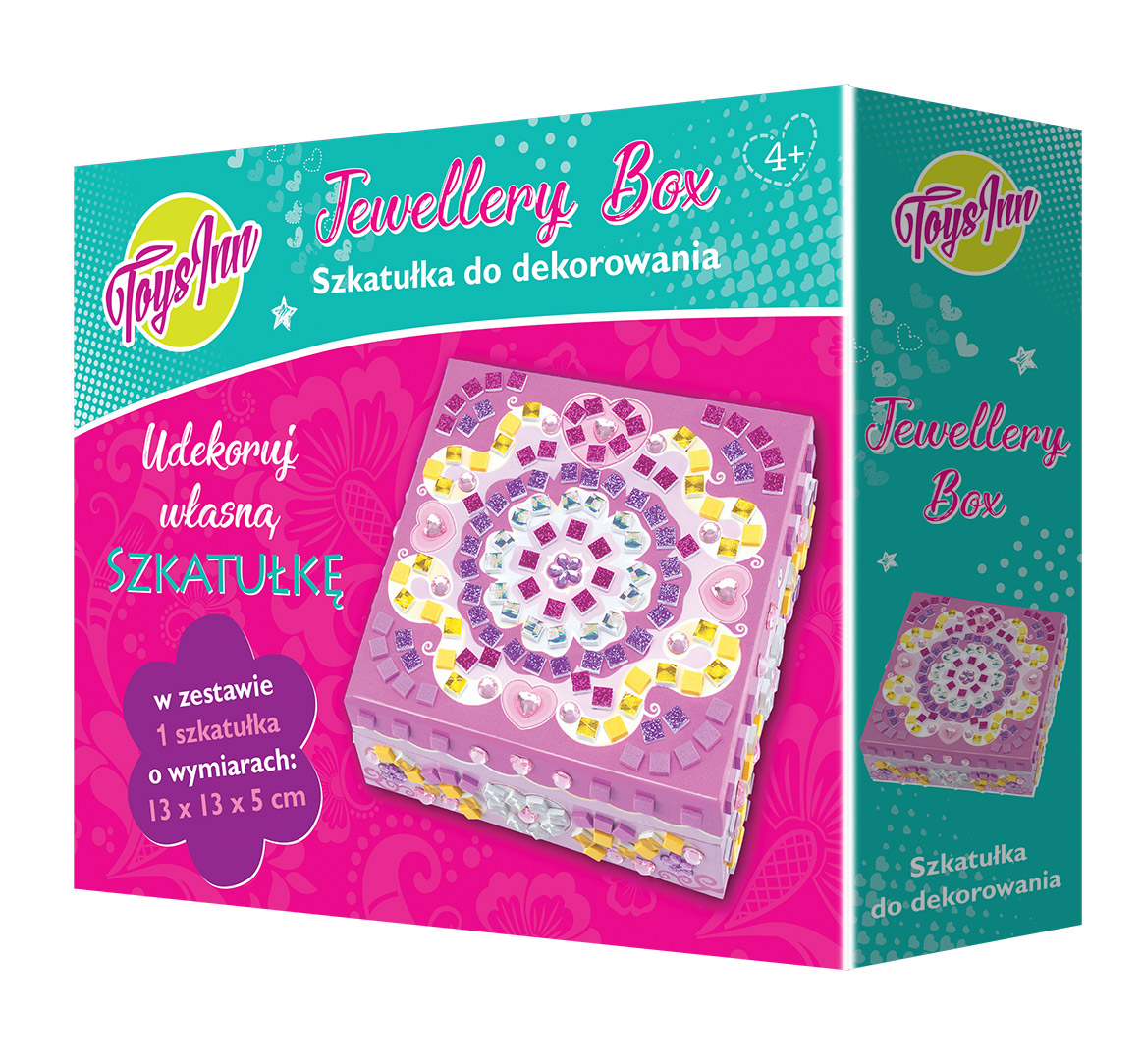 Potrzebujesz miejsca na biżuterię? Stwórz je sama! Wyjątkowa szkatułka do dekorowania to idealne miejsce na biżuterię i drobiazgi. Pojemne pudełeczko można w prosty sposób udekorować dżetami i piankowymi kwadracikami, a następnie ukryć w nim drogocenne przedmioty. Zawartość – kwadratowa szkatułka o wymiarach 13x13x5cm, pianki samoprzylepne w 6 kolorach, dżety samoprzylepne w 3 kształtach. Uwagi – wiek 4+
