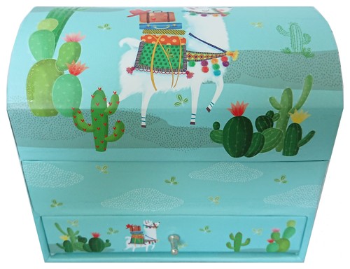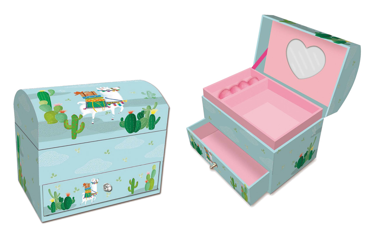 Kartonowa szkatułka z lusterkiem na wieczku, przegródką na pierścionki i wysuwaną szufladką.