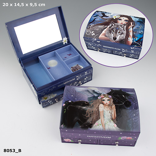 Szkatułka na biżuterię Fantasy Model. Szkatułka z lusterkiem, przegródki pod klapą i dwie szufladki. Dwa piękne, fantazyjne wzory do wyboru.