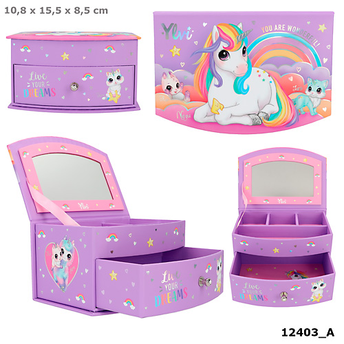 Szkatułka na biżuterię  Jednorożec Ylvi, z lusterkiem na wieczku, podział na 4 przegródki na górze, szufladka na drobiazgi na dole.