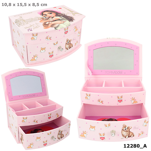 Szkatułka na biżuterię Top Model Corgi, z lusterkiem na wieczku, podział na 4 przegródki na górze, szufladka na drobiazgi na dole.